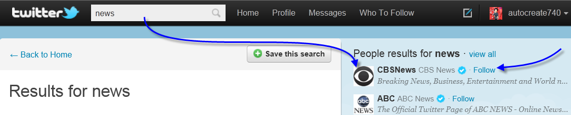 4 – If you do not want to Follow a particular choice (e.g., News) anymore, type News in the search field, click the magnifying glass to start the search. When you find what you are looking for, click the Unfollow link. You can also go to your Profile, view all you are following, and select to Unfollow from there.